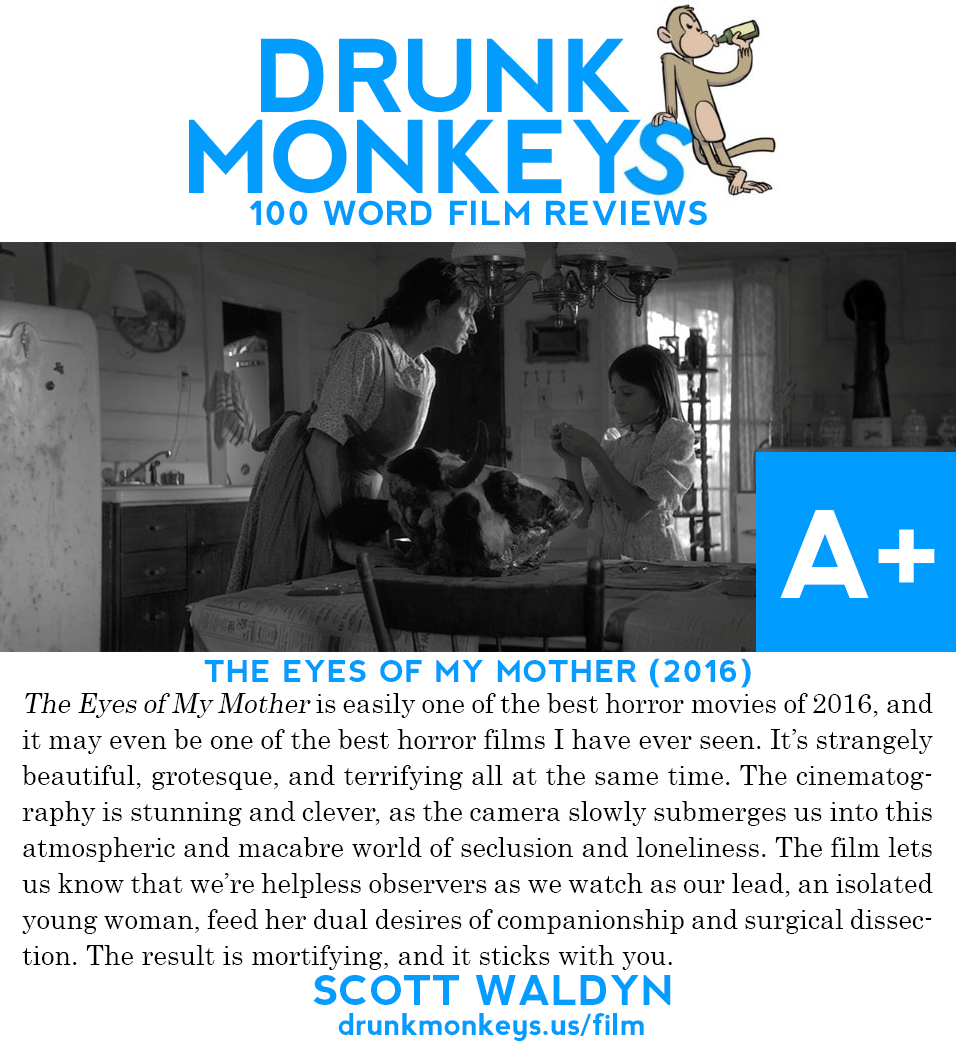 - Check out my review of the stellar indie film The Eyes of My Mother for Drunk Monkeys!